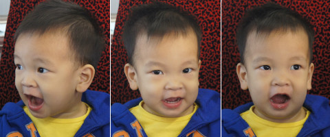 左邊是表演閉上眼睛假裝睡覺;右邊是上演父子情深大合照。